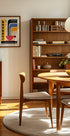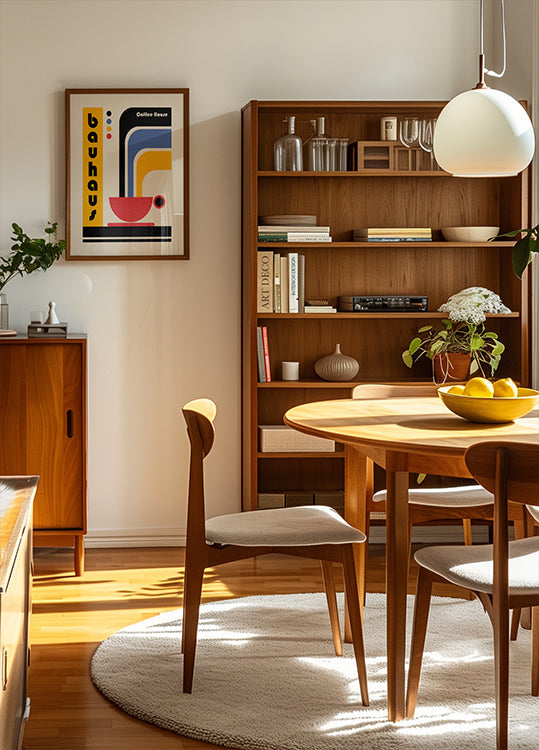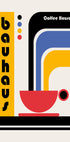 A Bauhaus inspired coffee house poster with bold geometric shapes in red, yellow, blue and black. The abstract design shows a steaming coffee cup in pure Bauhaus style, which combines functionality with artistic simplicity. Perfect wall art for retro kitchens, cafes and lovers of vintage modernism.
