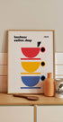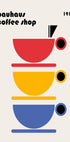 A Bauhaus-inspired coffee shop poster from 1919 featuring three stacked cups in red, yellow and blue in bold geometric shapes. Minimalist yet lively, this design expresses the artistic spirit of modernism and café culture. Perfect wall art for kitchens, coffee shops and lovers of the Bauhaus style.