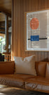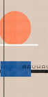 A minimalist Bauhaus-inspired poster with bold geometric shapes, including a large orange circle and a bold blue rectangle on a beige background. Straight lines and simple contrasts make this artwork a timeless element in both modern and vintage interiors.
