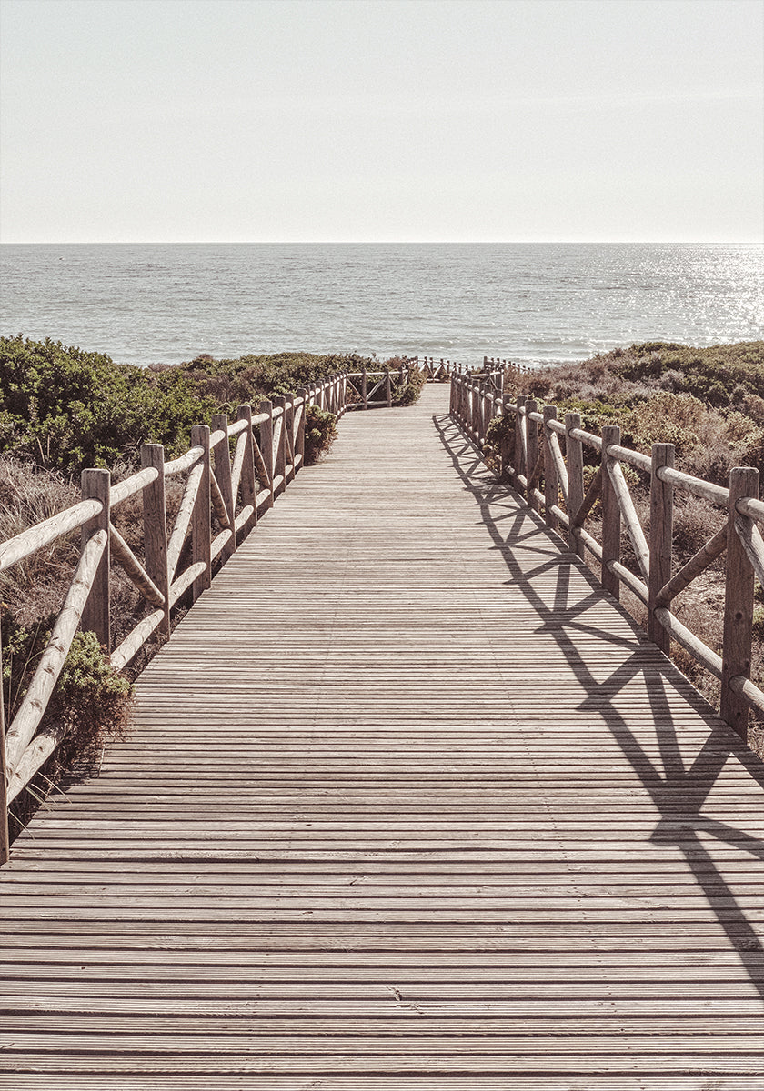 A serene coastal photograph showing a wooden boardwalk leading directly down to the sparkling sea. The vanishing point perspective invites the viewer to walk towards the horizon and evokes feelings of calm, freedom and the stillness of summer.