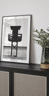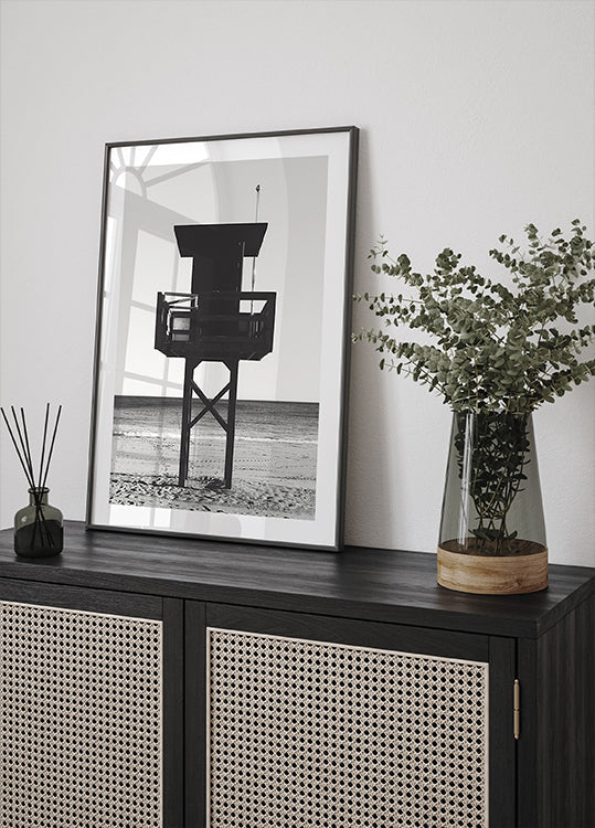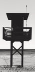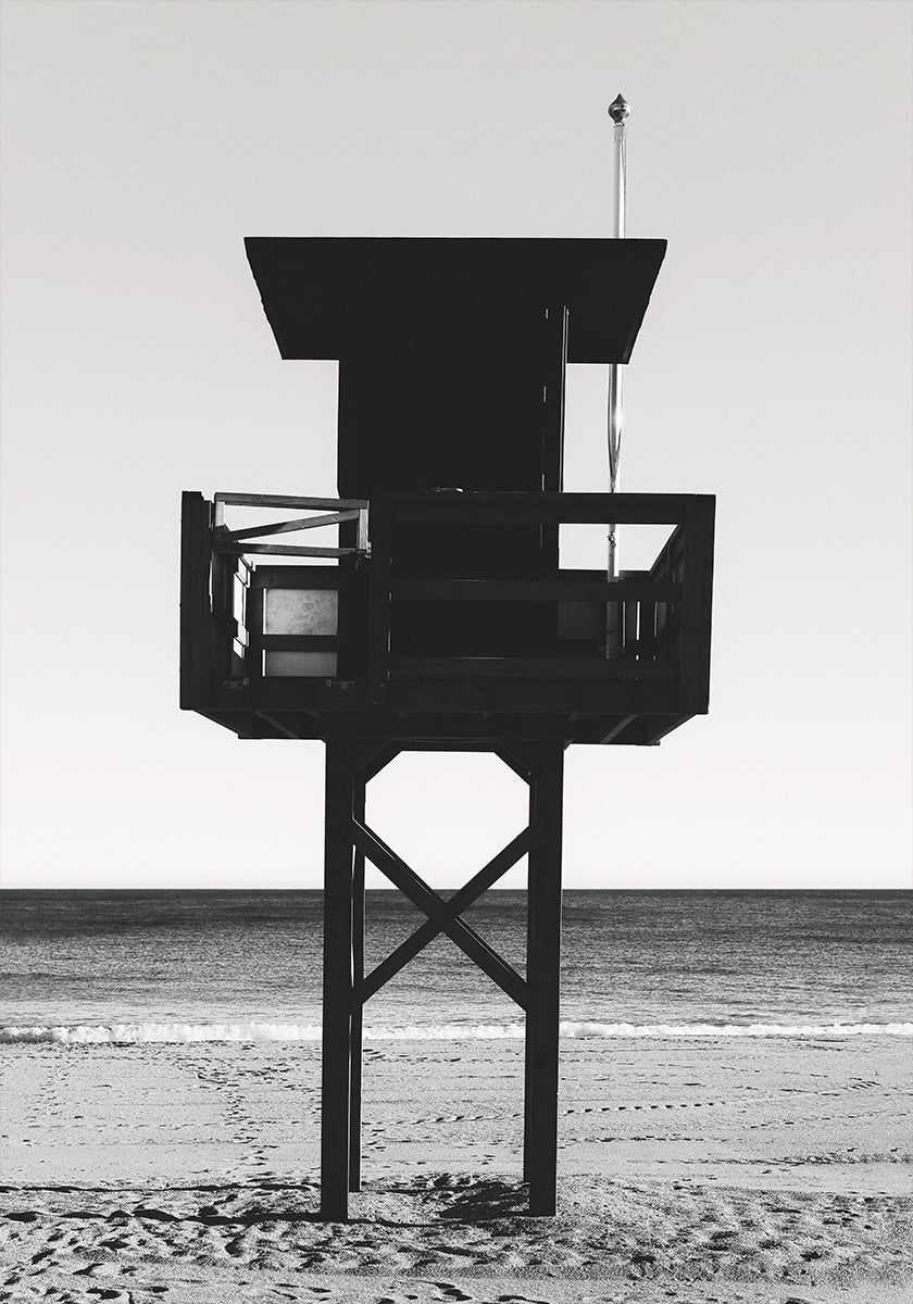 A striking black and white coastal photograph showing a lifeguard tower standing tall on the beach. The strong contrasts emphasize the tower's geometric structure against the calm sea horizon. A minimalist yet powerful piece of art, perfect for modern interiors with a coastal or monochrome look.