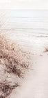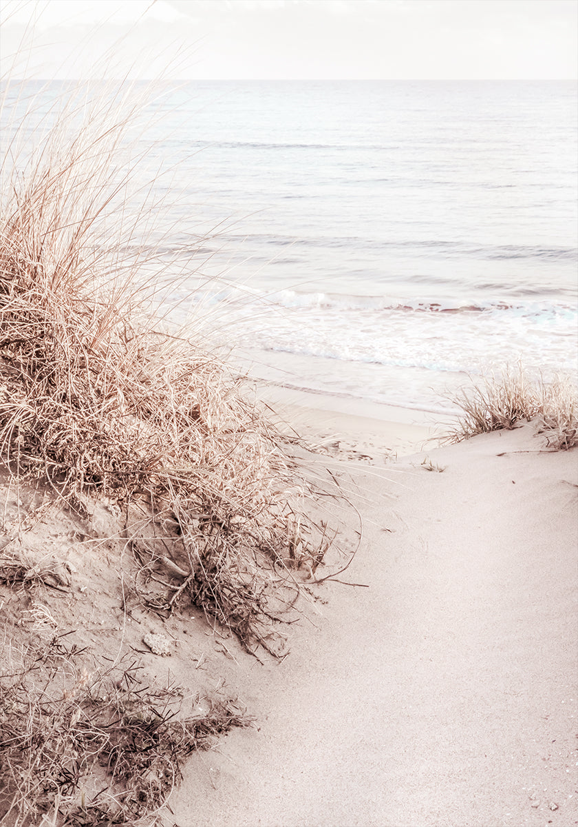 A peaceful coastal photograph that captures sand dunes with fine grass leading down to the tranquil coastline. The soft beige tones and the bright expression create a calm and natural atmosphere, ideal for decor inspired by the coast.