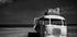 An evocative black and white photograph of an abandoned vintage bus stranded on a sandy beach. With worn suitcases piled on the roof and the sea in the background, the image expresses abandoned journeys, decay and the passage of time.