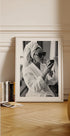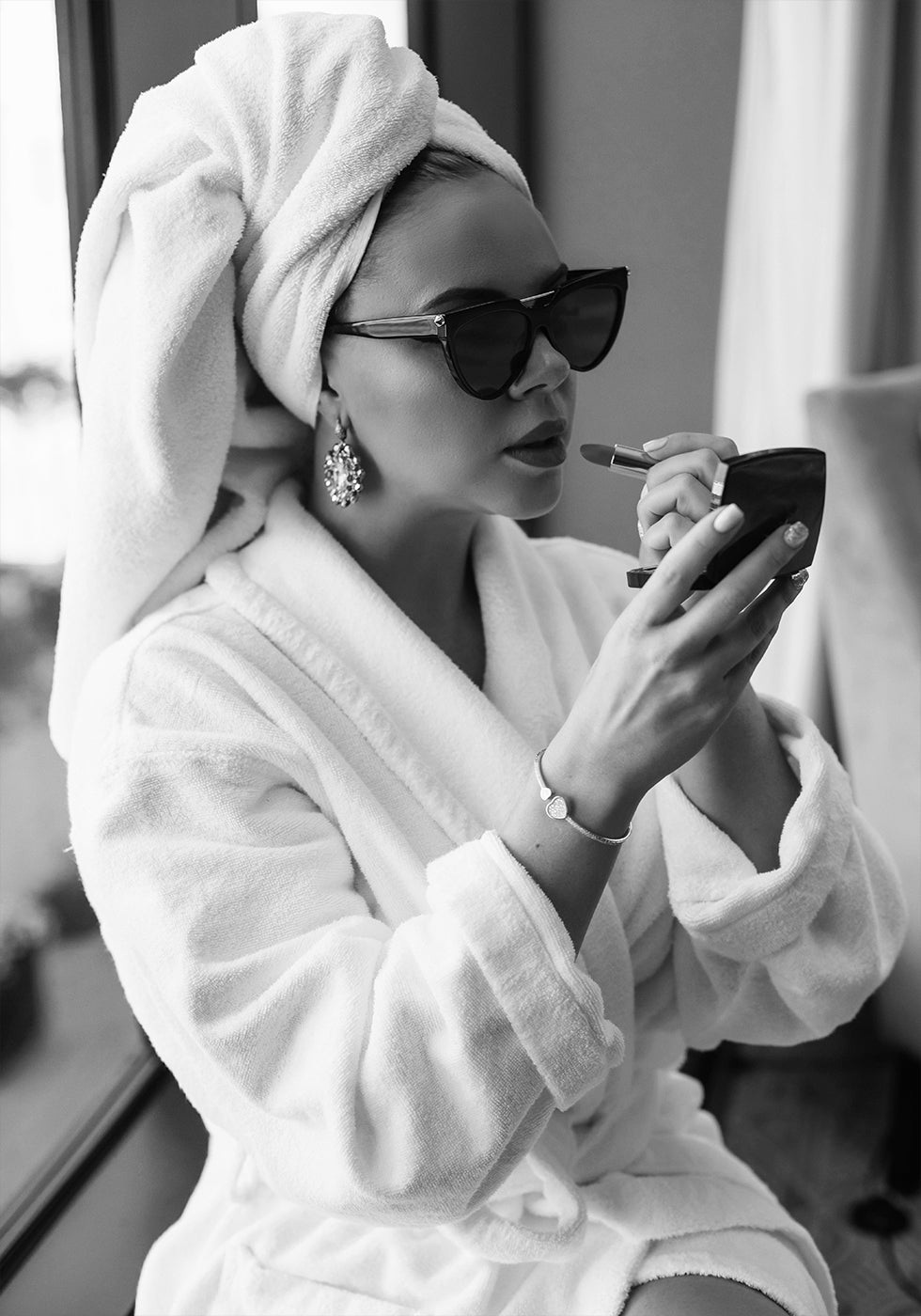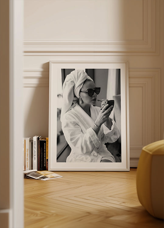 A sophisticated black and white photograph of a woman in a bathrobe with a towel around her head applying lipstick wearing sunglasses and statement jewellery. This elegant piece of art celebrates the beauty of small rituals and timeless glamour, perfect for fashion-inspired interiors.
