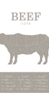 A minimalist and educational kitchen poster showing a cow with marked cuts of meat, from ribs and tenderloin to flank and breast. Designed in neutral colors with clear typography, this is a stylish and informative piece of wall art perfect for kitchens, butcher shops, restaurants or country interiors.