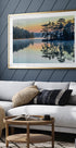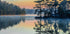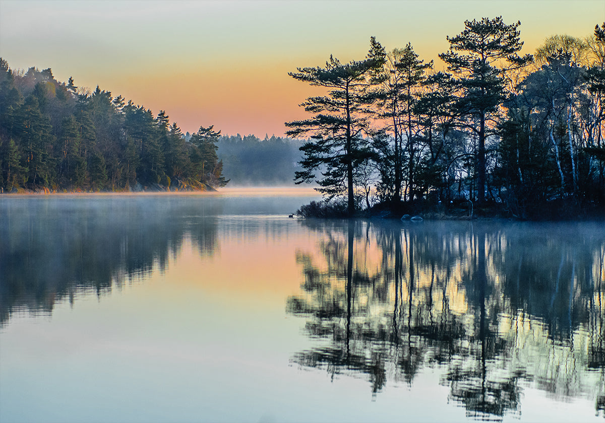 A peaceful lake scene at dawn, captured in Sweden with mist rising over the still water. The reflection of pine trees glows in the soft sunlight and creates a calm and meditative atmosphere filled with peace and harmony.