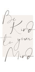 A calming minimalistic typography poster with the handwritten quote “Be Kind to Your Mind.” A gentle reminder of mindfulness, positivity and self-care, perfect for bedrooms, offices, therapy rooms or wellness areas. The soft tones and the elegant calligraphy provide both inspiration and tranquility to any wall.