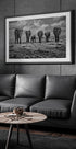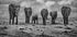 A stark black and white wildlife photograph of a herd of elephants roaming the African savannah. The image captures both strength and tenderness and symbolizes family, protection and unity in nature.