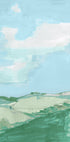 A soft abstract landscape painting with green hills and a big blue sky with light clouds. Inspired by the English countryside and Dartmoor, this watercolor-like artwork adds a calm and airy atmosphere to any room. Perfect for nature lovers and those who want peaceful wall art.
