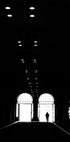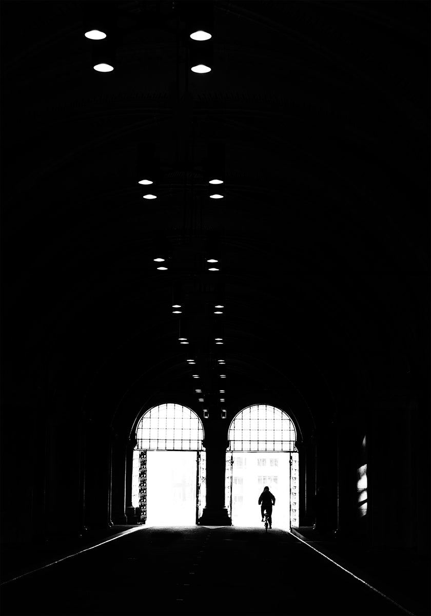 Bike in Amsterdam by Seray AK captures a lone cyclist silhouetted in an illuminated arcade in Amsterdam. The rider glides through curved passages where light and shadow create graphic lines, depth and a clear vanishing point. The contrast and the night light emphasize the city's graphic arcades. The perspective directs the gaze towards depth.