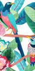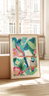 A colorful illustration of two exotic birds sitting among lush tropical leaves and blooming flowers. The bright colors and playful composition create a bright and refreshing piece of art, perfect for adding life to a gallery wall.