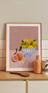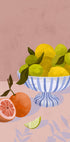 A charming still life illustration of a striped bowl filled with lemons and limes, accompanied by a sliced blood orange and a lime wedge. With warm tones and picturesque textures, this artwork brings a fresh, Mediterranean-inspired vibe, perfect for a kitchen or dining room.