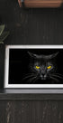 A powerful close-up portrait of a black cat with piercing yellow eyes that glow in the dark. This low-key photograph captures mystery, elegance and intensity, making it a striking piece of art for any modern interior.