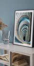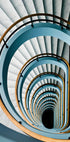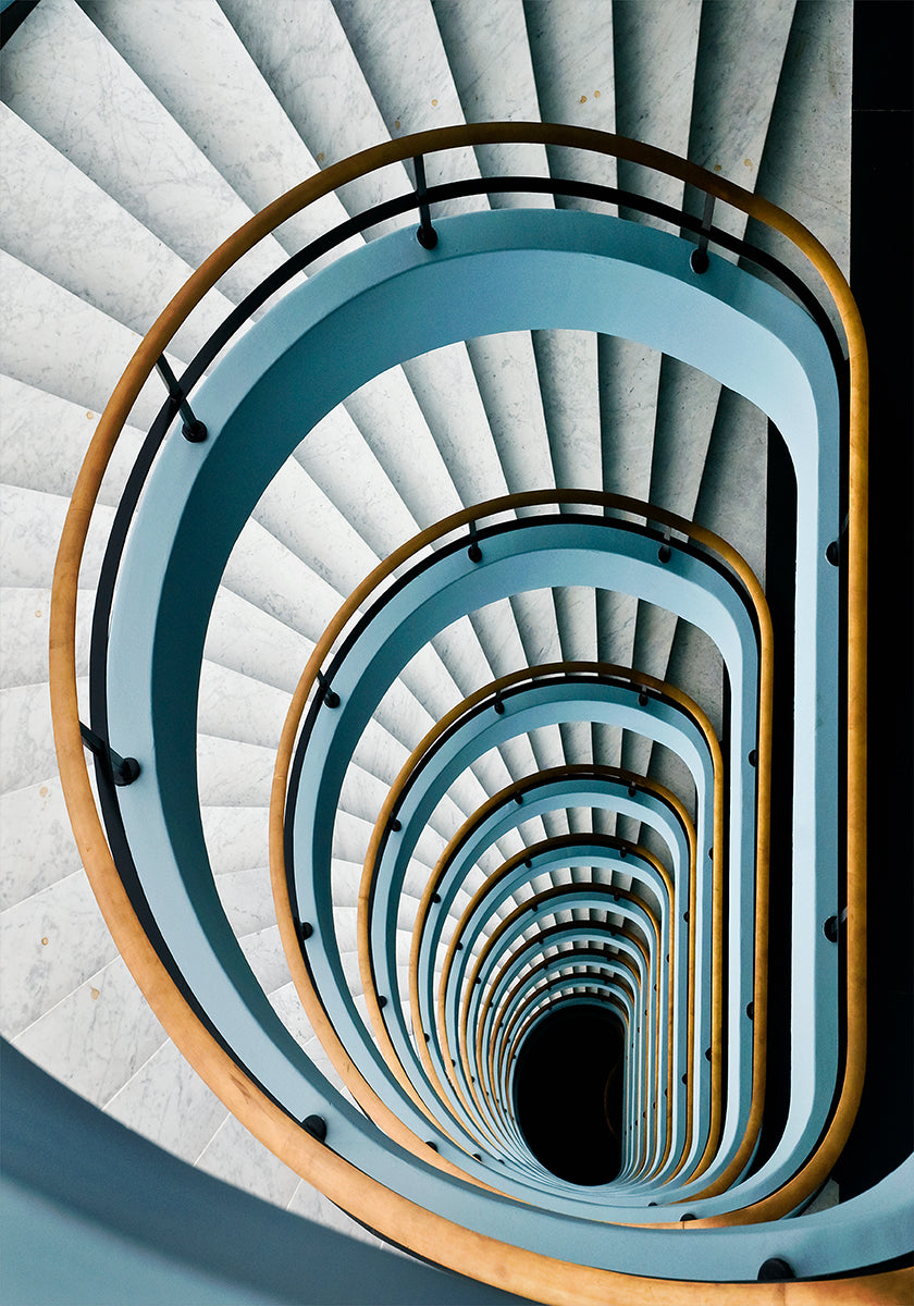 A fascinating photograph of a spiral staircase seen from above, creating a dizzying illusion of infinity. With its flowing curves, geometric precision and modernist elegance, this architectural work of art makes a striking statement in any interior.