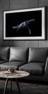 A powerful low-key underwater photograph of a majestic humpback whale swimming gracefully through the dark depths of the ocean. This dramatic piece of art captures both the size and beauty of one of nature's true giants and is perfect for creating a bold and inspiring mood in any space.