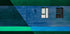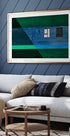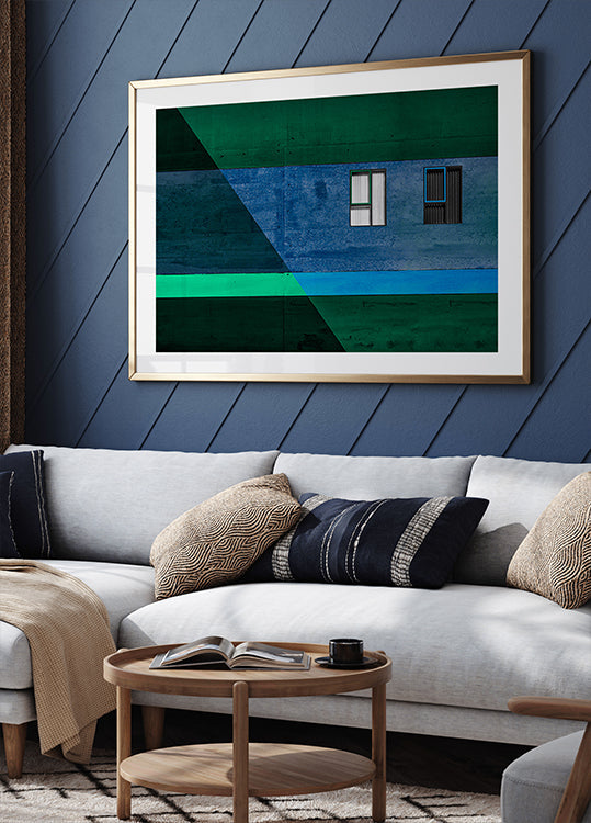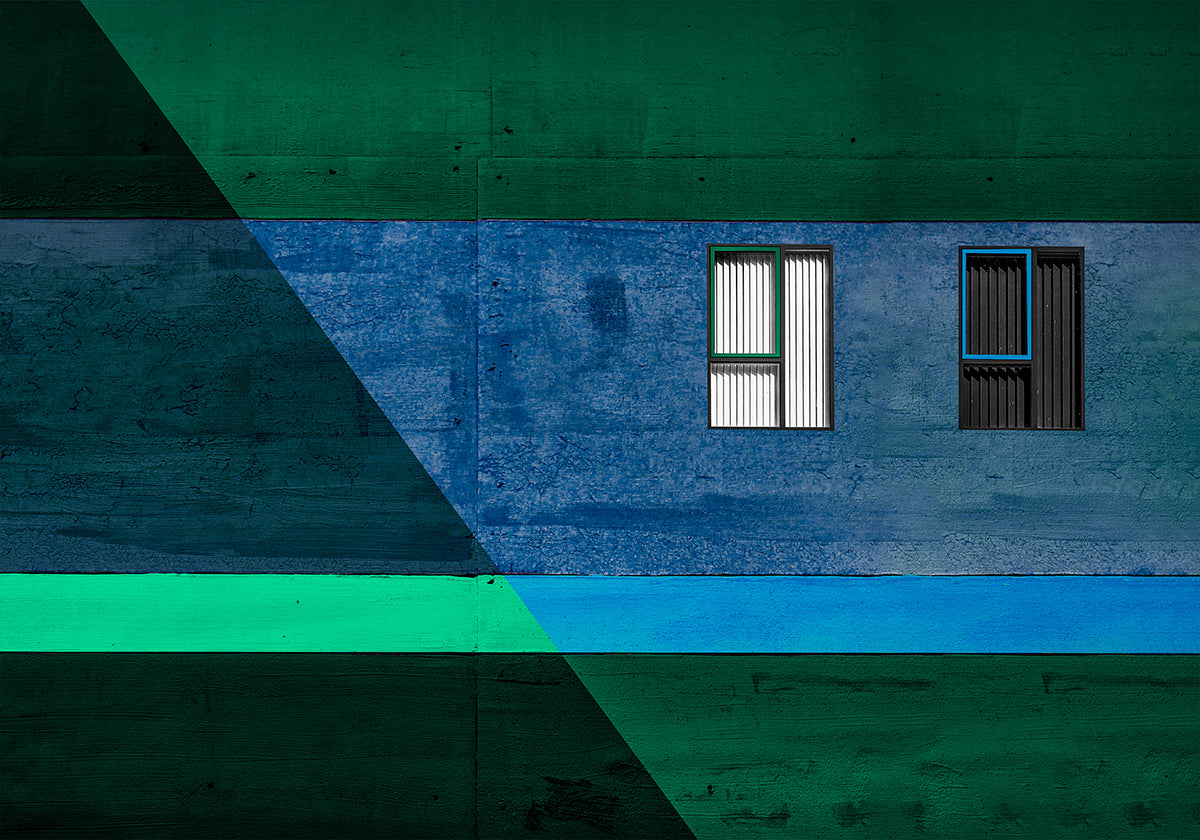 A bold architectural work of art with two windows with bold black and white blinds, set against a textured wall in deep blues and greens. The sharp lines and the geometric composition create a modern abstract work full of balance, contrast and visual excitement.