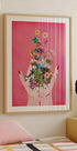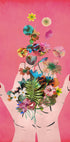 A vibrant and modern artwork showing hands releasing an explosion of colorful flowers and leaves against a pink background. The floral collage unites nature and creativity and symbolizes growth, renewal and beauty. Perfect for modern interiors with a touch of botanical charm.