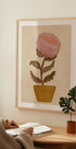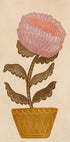 A charming watercolor artwork featuring a delicate pink flower in a golden vase. With textured vintage style and soft pastel colors, this hand-painted piece combines retro design with botanical elegance, a timeless choice for floral decoration.