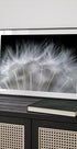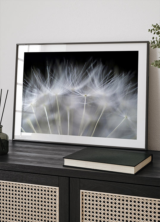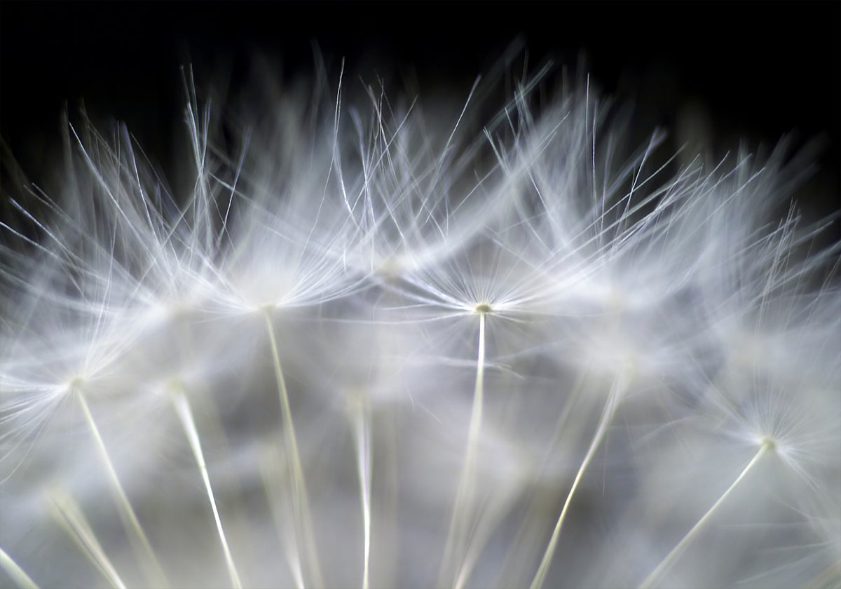A delicate macro photograph of dandelion seeds, capturing their feathery softness and beauty. The close-up highlights the fragile and fleeting nature of these airy tufts.