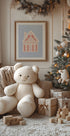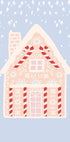 A fairy-tale blue gingerbread house stands in the middle of a winter landscape, decorated with sugar canes, snowflakes and frozen details. Warm lights in the windows invite coziness, while the clear, calm background emphasizes the graphic simplicity of the motif. A charming Christmas poster by Talitha McQueen. Perfect for a children's room, entrance hall or living room ready for a cozy Christmas atmosphere.
