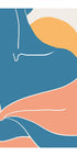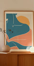 A minimalist abstract artwork of a female figure, done in geometric blue and peach colored shapes with a golden sun in the background. The composition emphasizes curves and shapes and combines modern simplicity with mid-century elegance.