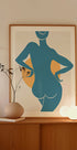 Blue Woman by Pictufy Studio II shows a stylized female figure from the back, rendered in deep blue with soft, graphic lines. The cool tone meets warm yellow accents in a mid-century inspired composition that exudes calm, poetry and modern elegance – perfect for the living room, bedroom or home office.