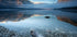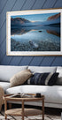 A serene landscape poster of Lake Bohinj in Slovenia, where still waters mirror the mountains and mist. The clear coastline with stones and a tree trunk enhances the calm and harmonious atmosphere, ideal for creating peace and tranquility in any space.