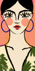 A lively and stylish fashion portrait poster of a woman with bold eyelashes, big earrings and elegant colors. The peach colored background and picturesque textures give it a modern artistic expression, making it an eye-catching piece in modern interiors.