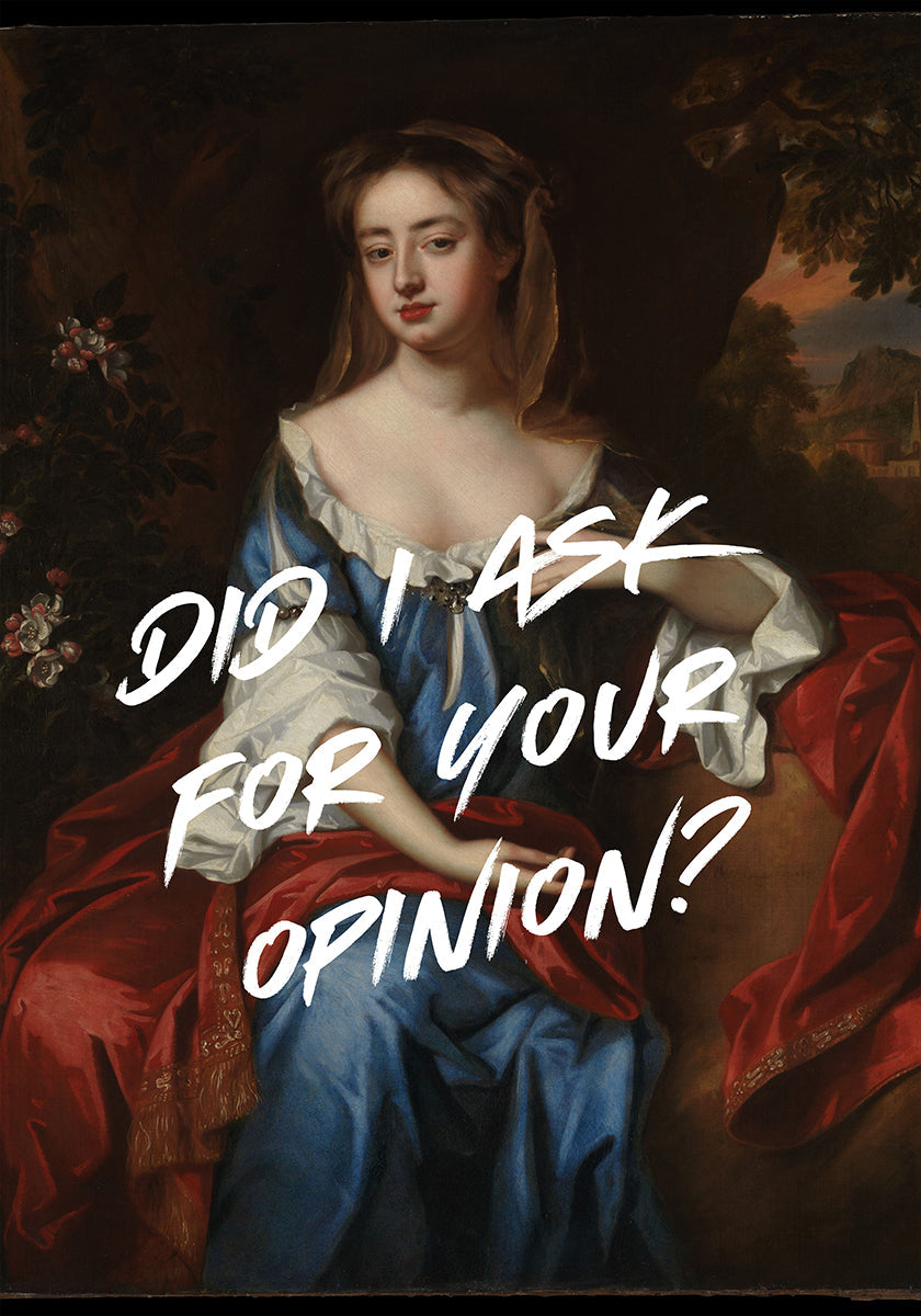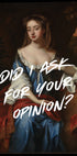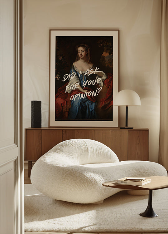 This humorous poster combines a refined baroque portrait with bold handwritten text: “Did I ask for your opinion?”. The interplay of vintage elegance and modern satire creates a humorous, rebellious statement, perfect for adding personality and edge to any wall.