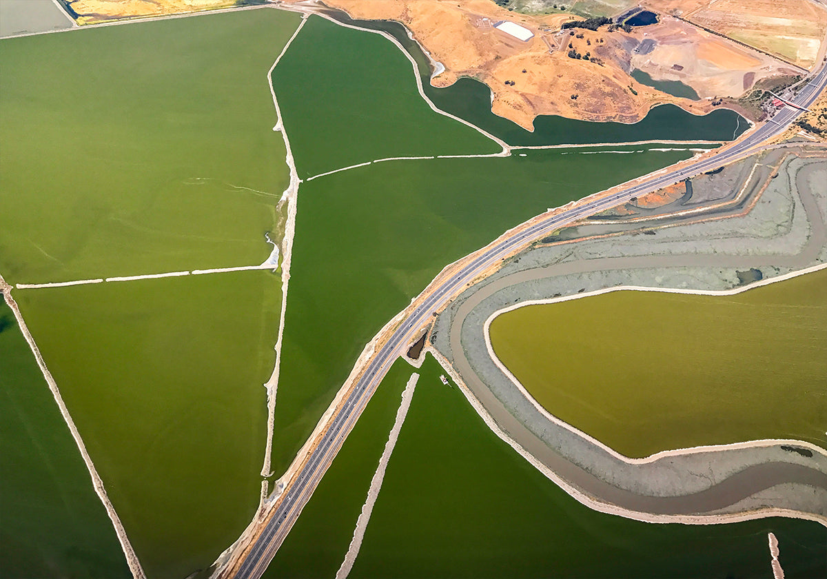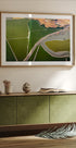 A stunning aerial photograph of the San Francisco Bay landscape, where winding roads, streams and green fields form distinct geometric patterns. Captured from above, this artwork highlights the beauty of the boundaries of nature and man-made, making it modern photographic wall art.