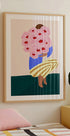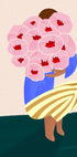 A modern abstract illustration of a woman holding a large bouquet of pink flowers, painted in strong and vibrant colors. With its minimalist shapes, striped pants and modern design, this work of art fits perfectly into stylish interiors. A playful yet elegant wall decoration.