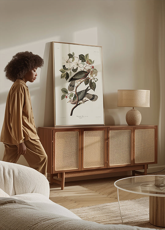 A vintage ornithological illustration by John James Audubon, titled Brand-tailed Pigeon from his famous Birds of America (1827). This detailed hand-drawn artwork captures the natural beauty of doves among flowering branches, making it a timeless piece of natural history and a perfect addition to classic wall decor.