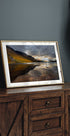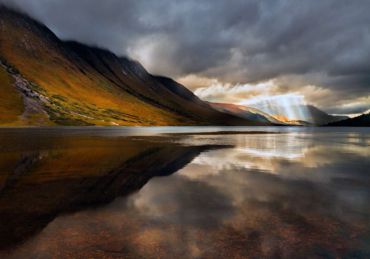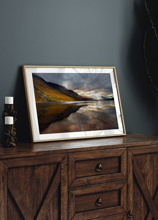 A stunning landscape poster from Glencoe, Scotland, where dramatic clouds open and sunbeams fall over the highlands and lake. The calm water mirrors the rugged mountains and creates a powerful yet peaceful composition that captures the harmony and silence of nature.