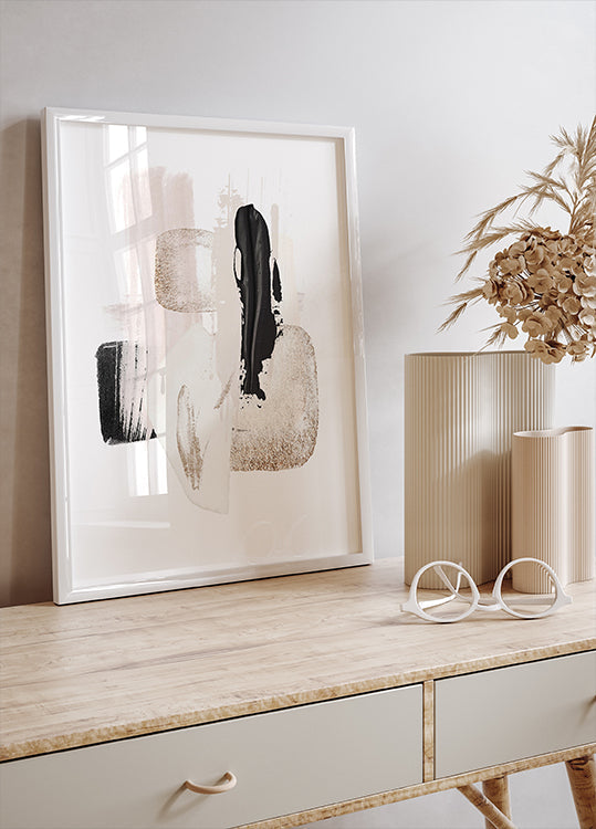 A stylish abstract poster with textured brush strokes in black, beige and gold colours. The modern composition combines painterly textures with minimalist elegance, perfect for modern interiors and art lovers.