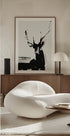 An abstract, black-and-white portrait of a deer created with strong, expressive brushstrokes. Face and antlers can be seen in the raw, artistic strokes, which give the motif a dramatic and modern expression.