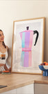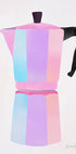 A pastel colored illustration of a classic Italian mocha pot, in soft pink, blue and lavender colors against a minimalistic white background. The piece celebrates morning rituals and coffee culture in a fresh, modern style, perfect for brightening up the kitchen and adding a playful yet elegant touch.