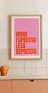 Bright, bold and humorous - this modern typography poster features the playful phrase "More Espresso Less Depresso" in bold orange text on a pink background. A perfect combination of motivation and fun, ideal for kitchens, offices or coffee corners. Perfect for coffee lovers with a sense of humor.