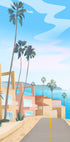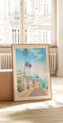 A bright and colorful coastal illustration with palm trees, seaside houses and the sparkling sea. This artwork captures the laid back California summer vibe, perfect for beach and travel inspired wall decor.