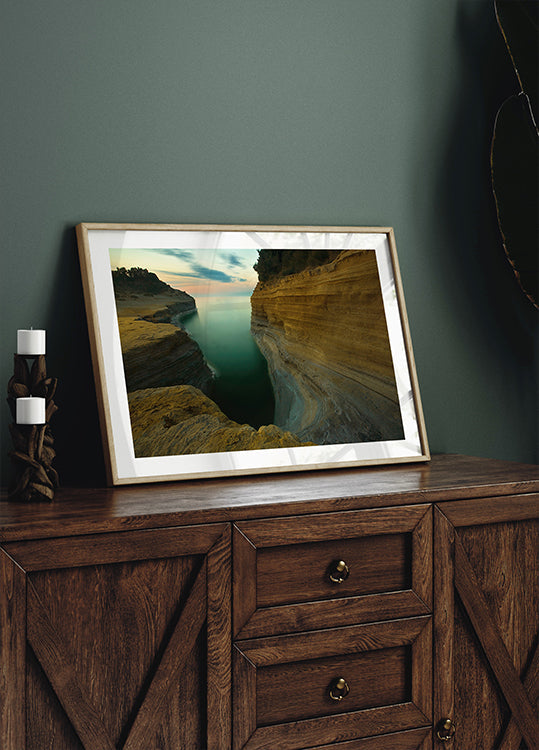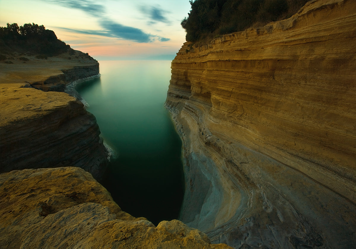 A serene long exposure shot of the iconic Canal d'Amour in Corfu, Greece. The emerald waters are framed by dramatic sandstone cliffs, creating a mysterious and romantic atmosphere. This coastal landscape captures the natural beauty, timeless tranquility and legendary charm of the Ionian Sea.