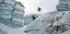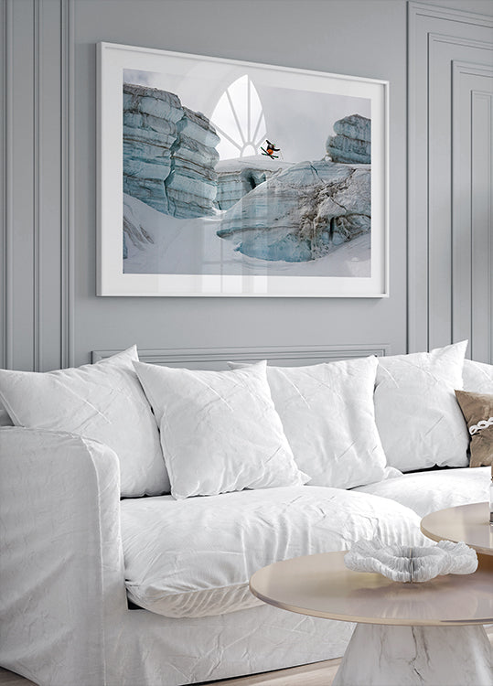 A breathtaking action shot of freestyle skier Candide Thovex soaring through the air between huge ice glaciers. Shot in Chamonix, France, this image captures the adrenaline, skill and fearless spirit of winter sports. The frozen landscape and gravity-defying jump make it an iconic tribute to adventure and extreme skiing.