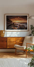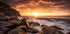 A stunning seascape at Cape Solander, Sydney, captured at sunrise. The golden sunlight streams over the horizon, illuminating the waves of the sea and the raw rocks with a warm, glowing light. The silky water, created by long exposure, contrasts beautifully with the dramatic, cloud-filled sky and evokes both strength and calm.