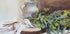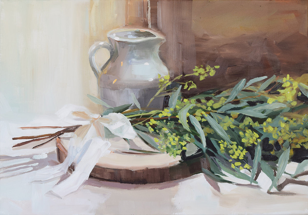 A charming still life painting of a rustic jug with delicate foliage and yellow flowers arranged next to it. The artwork captures a warm, timeless atmosphere with its painterly brushstrokes, muted tones and soft contrasts. Perfect for creating a cosy, vintage-inspired atmosphere.