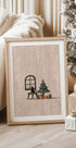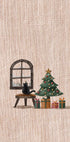 A charming embroidery inspired artwork featuring a black cat sitting by a window looking out at the snow. A decorated Christmas tree with gifts creates coziness and a Christmas atmosphere, perfect as Christmas decor for the home.