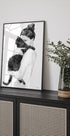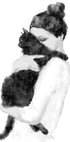 A delicate black and white watercolor style illustration of a woman embracing her cat. This sensitive artwork expresses love, intimacy and the timeless bond between human and pet, perfect for minimalist and animal-inspired interiors.