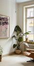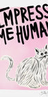 A humorous and playful cat poster with the clear text "Impress Me Human" and a funny sketch of a fluffy cat on a pink background. Perfect wall art for cat owners and cat lovers who like humor, illustration and typography.