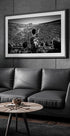 A powerful black and white photograph that captures the electric atmosphere of a packed football stadium. A young fan in a Messi shirt points towards the pitch, symbolizing passion, heroism and the unifying spirit of the world's most beautiful game. This artwork is a tribute to the euphoric moments that make football more than just a sport.