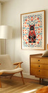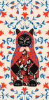 A playful and colorful illustration of a smiling cat designed like a Russian matryoshka doll, decorated with red and blue flowers. Perfect for children's rooms, charming interiors or for anyone who loves whimsical cat art with a joyful expression.