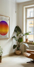 A modern minimalist artwork with a brilliant circular gradient inspired by the colors of the sunset. With a mix of deep purple, glowing orange and golden hues, this abstract design creates a harmonious focal point, perfect for modern interiors and creative spaces.