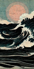 A dramatic Japanese-inspired wave artwork with a textured vintage style. The powerful ocean waves rise under a subdued sun, which unites traditional art with modern Japandi aesthetics. Perfect for lovers of seascapes and traditional wave paintings.