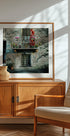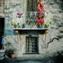 Chains of Gold by ambra captures a colorful urban moment: a young woman stands on a wrought-iron balcony, where golden chains wind like jewelry against a faded facade. A red door, flower pots and fine shadows create a contrast between urban patina and elegant poetry – a vibrant tribute to everyday architecture.
